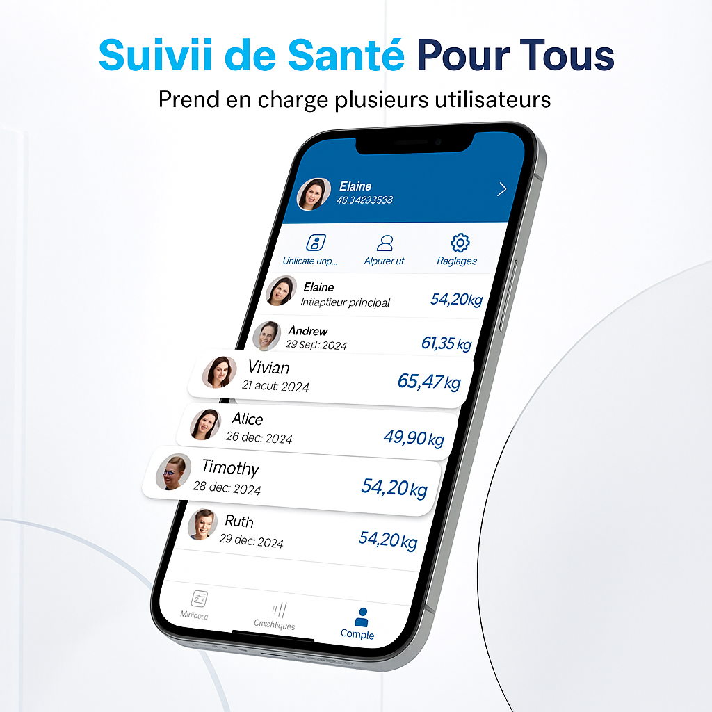 Vous y retrouvez un suivi complet : IMC, masse grasse, masse musculaire, taux d’eau et bien plus encore.