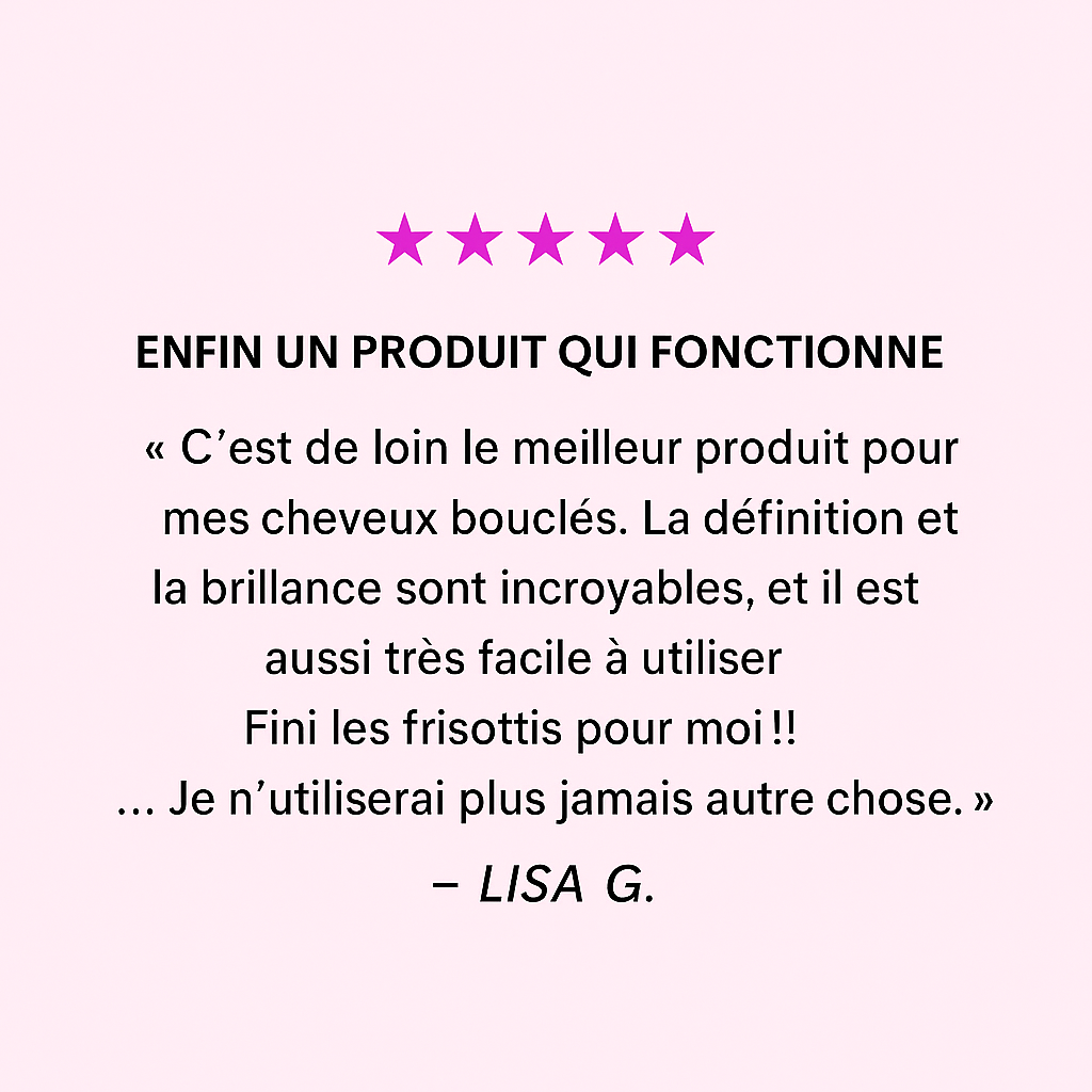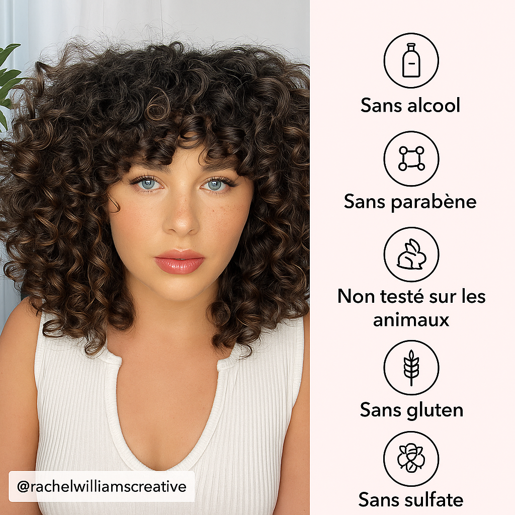 Notre spray révolutionnaire transforme tes cheveux humides en boucles définies, rebondies et légères, sans diffuseur, sans chaleur, sans effet carton.